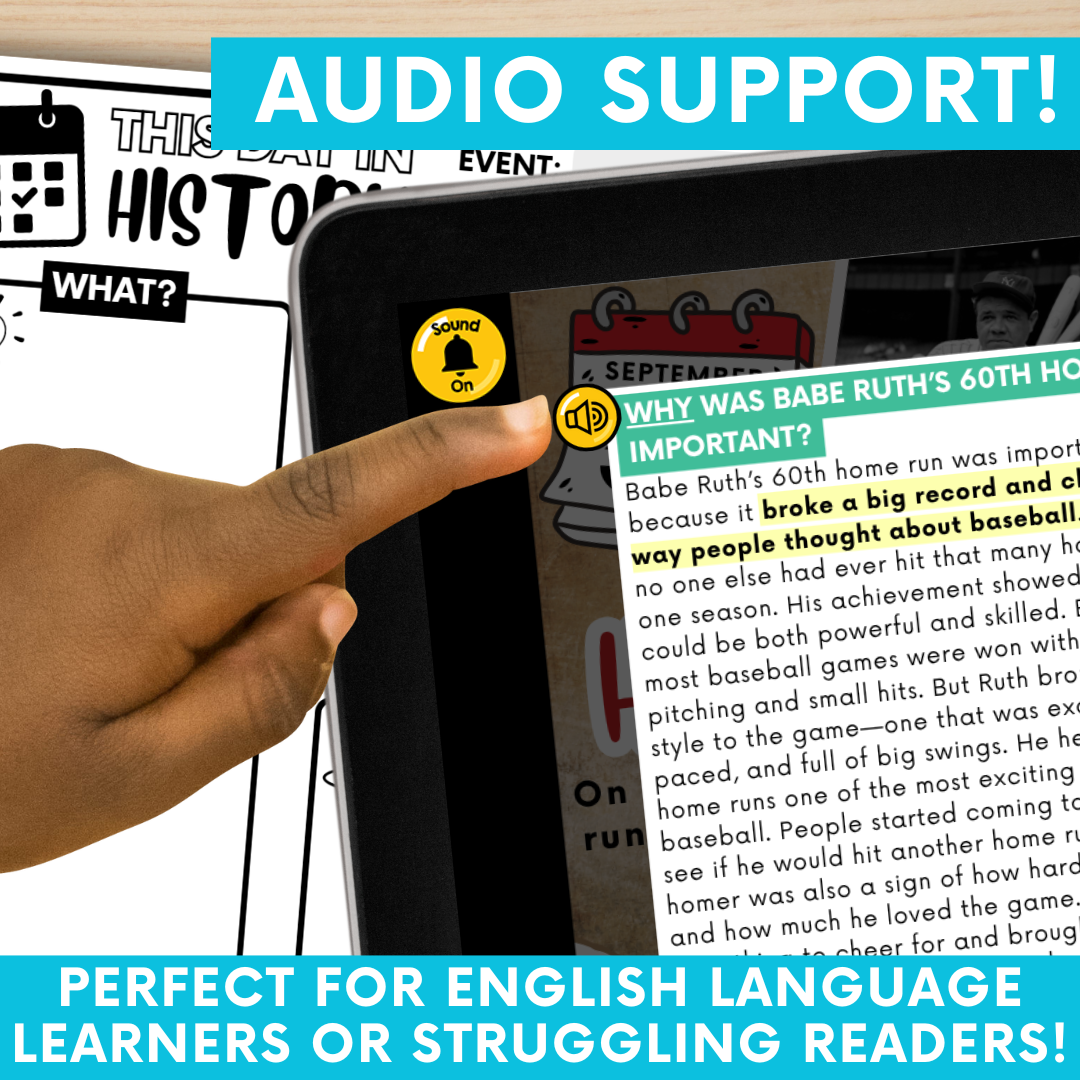 Our This Day in History digital LINKtivity® series is designed with diverse learners in mind, featuring user-friendly navigation and audio support that reads text to students, making it perfect for struggling readers and English language learners. Get ready for a fun and interactive learning experience!