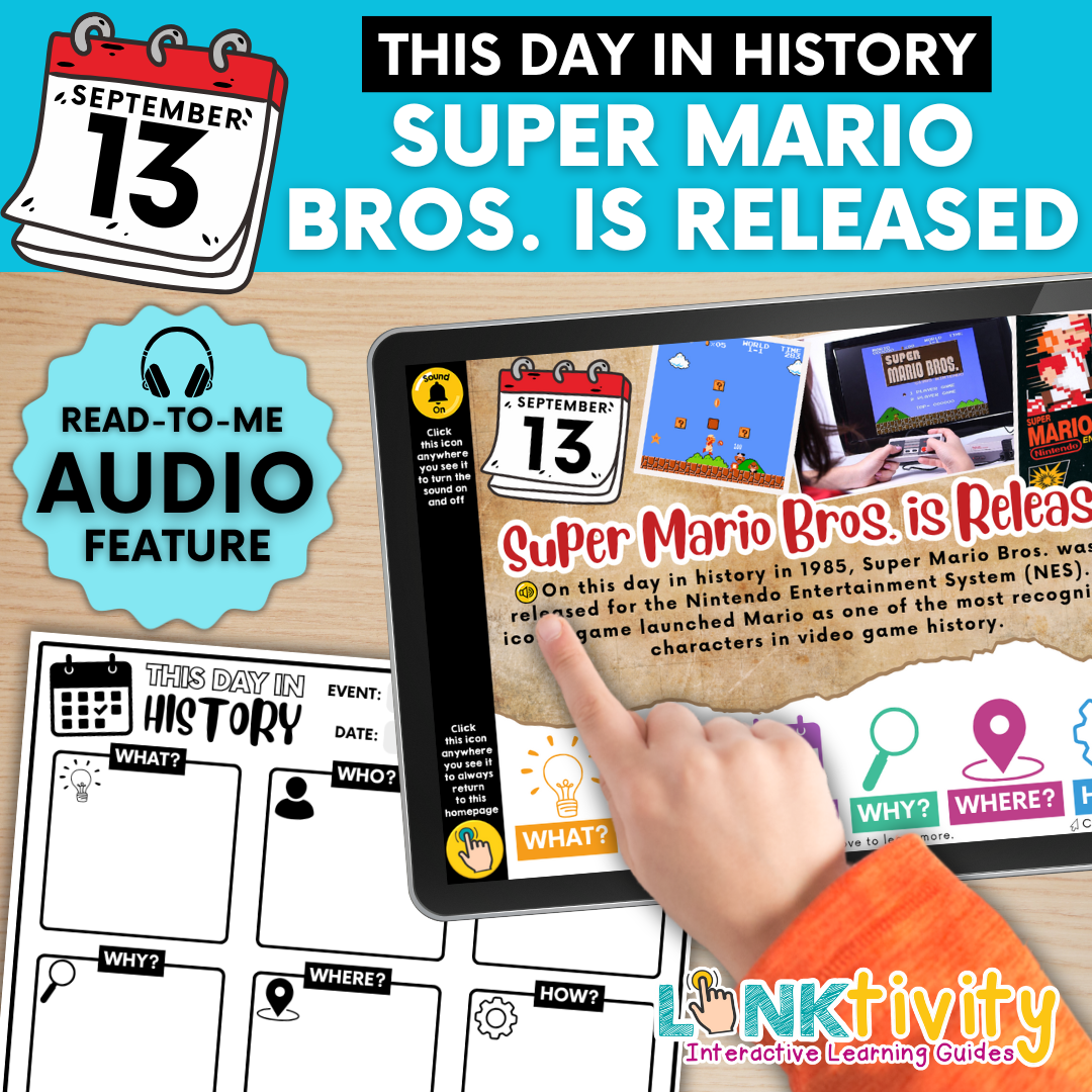 Our This Day in History digital LINKtivity® series is designed with diverse learners in mind, featuring user-friendly navigation and audio support that reads text to students, making it perfect for struggling readers and English language learners. Get ready for a fun and interactive learning experience!