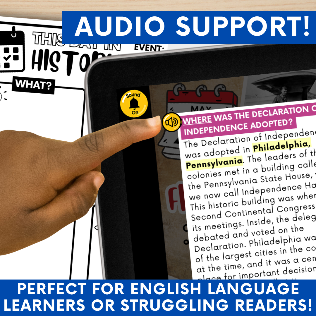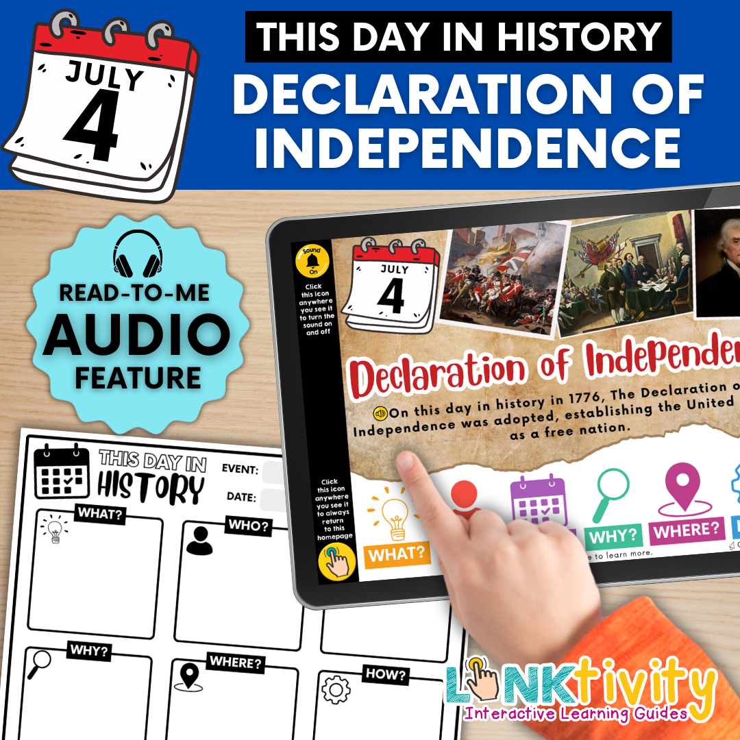 Our This Day in History digital LINKtivity® series is designed with diverse learners in mind, featuring user-friendly navigation and audio support that reads text to students, making it perfect for struggling readers and English language learners. Get ready for a fun and interactive learning experience!